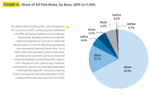 However, these numbers are still very much unequal when compared to the United States demographic. Currently the USA is 60.4% white when the Hollywood films’ cast diversity gravitates around 67% in 2019.