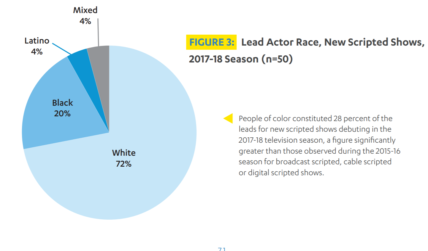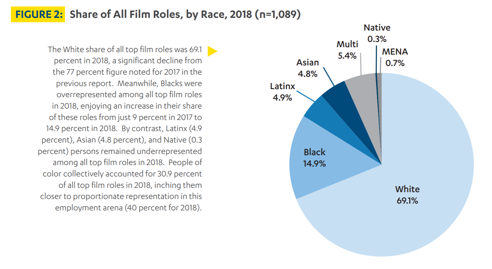 However, these numbers are still very much unequal when compared to the United States demographic. Currently the USA is 60.4% white when the Hollywood films’ cast diversity gravitates around 67% in 2019.